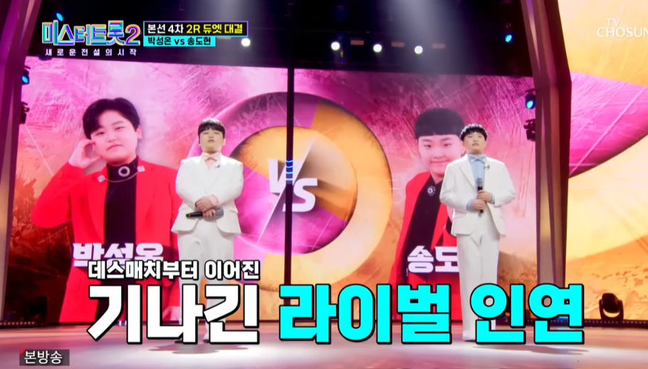 다시만난 라이벌 박성온과 송도현은 안성훈의 '엄마꽃'으로 감동 무대를 선사했고 치열했던 두 번째 꼬마대첩에서는 송도현이 아슬아슬하게 승리했습니다.